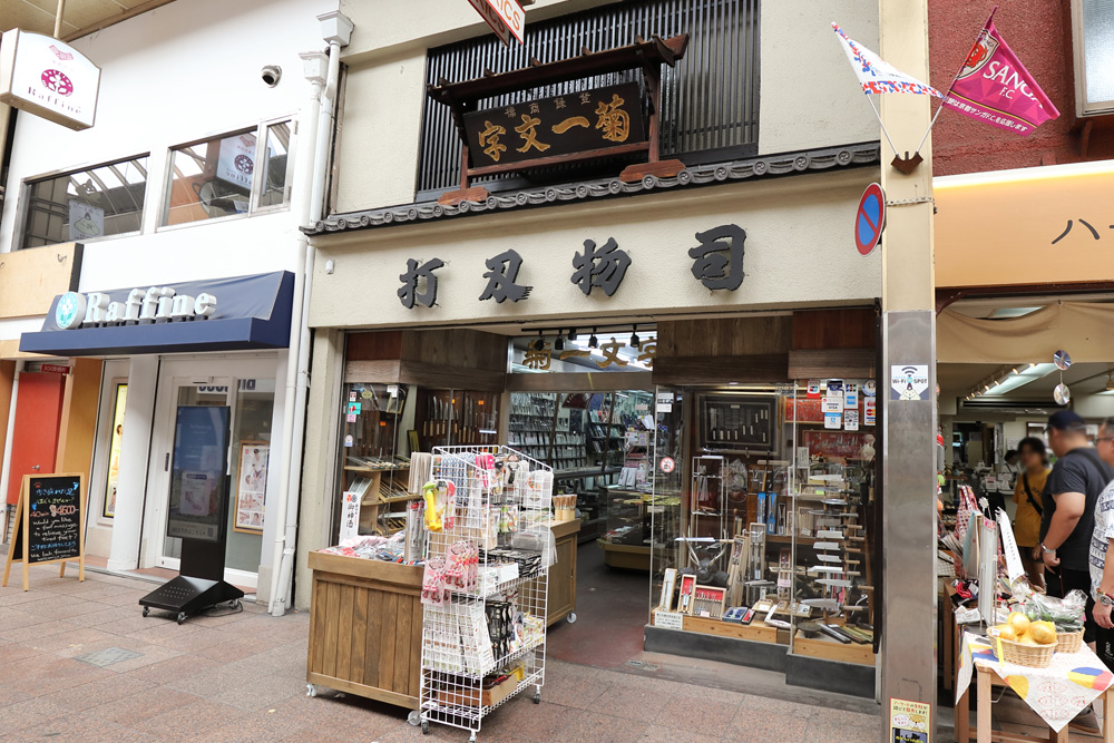 刀匠則宗が、作刀に菊の御紋を頂き、その下に横一文字を彫った事から、通称菊一文字と言われ、作刀を中止した明治以後、一般刃物を中心に製作、販売し、高級刃物なら「菊一文字」と言われ現在に至っております。